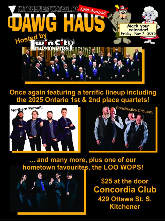 Starting on October 21th, the first hour of our regular Tuesday night rehearsal (Luther Village Sunshine Centre) will be devoted to this program. Guests, of course, are welcome to stay for the rest of the evening. The Christmas shows take place on December 6th in St. Jacob's and December 7th in Tavistock, both matinee performances.